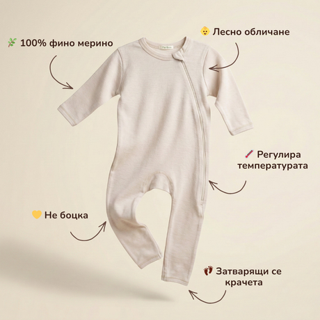 Гащеризон (ромпър) от 100% сертифицирано фино мерино с цип отстрани